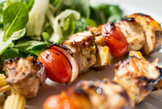 6. 用竹簽串起冷藏好的雞肉,隨后用中火迅速烤制成型;然后蘸取之前烹制的醬汁以及黃芥末,繼續(xù)烤制,直到雞肉變成金黃色;