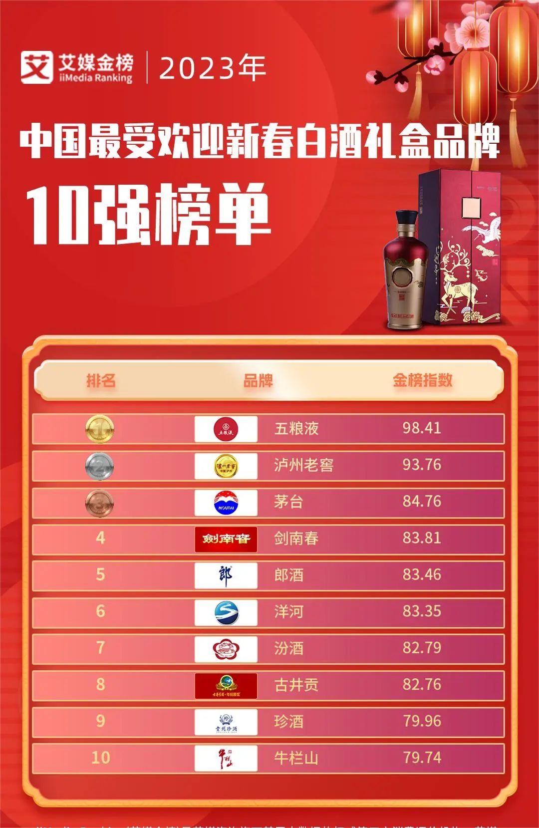 在iiMedia Ranking(艾媒金榜)最新發布的《2023年中國最受歡迎新春白酒禮盒品牌10強榜單》中,五糧液、瀘州老窖、茅臺、劍南春、郎酒、洋河、汾酒、古井貢等品牌名列前茅。而京東超市發布的《2023春節酒類消費報告》顯示,消費者選擇茅臺、五糧液、洋河、瀘州老窖等名酒品牌禮盒的最多,占比超過50%。