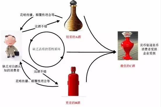 在企業(yè)急需業(yè)績的情況下,市面若出現(xiàn)一款銷售火爆的產品,必然成為眾多企業(yè)和渠道商研究甚至模仿的對象,但我們應該注意這樣的產品并不一定勝在品質。不明就里和不懂白酒的消費者被廣告、新奇的外包、花哨的傳播甚至顛覆性的理念所引導,讓低劣產品占據心智,形成錯誤的主觀臆斷。在反復的狂轟濫炸下,本來就不具備鑒別能力的消費者甚至是渠道商將完全喪失最后殘存的鑒別能力。將價格差異巨大的高品質酒和低品質酒的優(yōu)劣判斷錯誤,常喝中低端酒的難以接受品質更好的酒品的滋味和口感,類似情況較為普遍。當僅以銷量為王,以走了樣的失去品質支撐的“市場導向,消費者關注”驅動,忽悠消費者的劣幣驅逐良幣蔚然成風時,白酒的品質觀就真的亂了,中國白酒就沒有了傳承,也就沒有了未來!