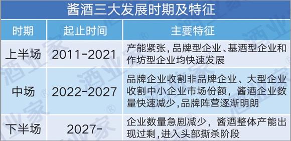 醬酒下半場:從2027年開始醬酒進入下半場,即頭部品牌競爭時代。這個時期,品牌和企業(yè)數(shù)量急劇減少,醬酒整體產(chǎn)能開始出現(xiàn)過剩,品牌進入頭部廝殺階段,行業(yè)前十的品牌格局基本穩(wěn)定。醬酒產(chǎn)業(yè)的市場體量和濃香并駕齊驅(qū),行業(yè)駛?cè)氚足y時代。