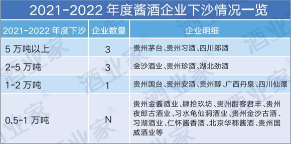 2021-2022年度,下沙投產(chǎn)達5萬噸以上的企業(yè)3家:貴州茅臺、貴州習酒、四川郎酒;達到2萬噸以上的有3家:金沙酒業(yè)、貴州珍酒、湖北勁酒;產(chǎn)能達到1萬噸以上的有5家:貴州國臺、貴州安酒、貴州醇、廣西丹泉、四川仙潭;產(chǎn)能達到0.5萬噸以上的比較多:貴州金醬酒業(yè)、肆拾玖坊、貴州酣客君豐、貴州夜郎古酒業(yè)、習水龜仙洞酒業(yè)、貴州金沙古酒、習湖酒業(yè)、仁懷醬香酒、北京華都醬酒、貴州國威酒業(yè)等。