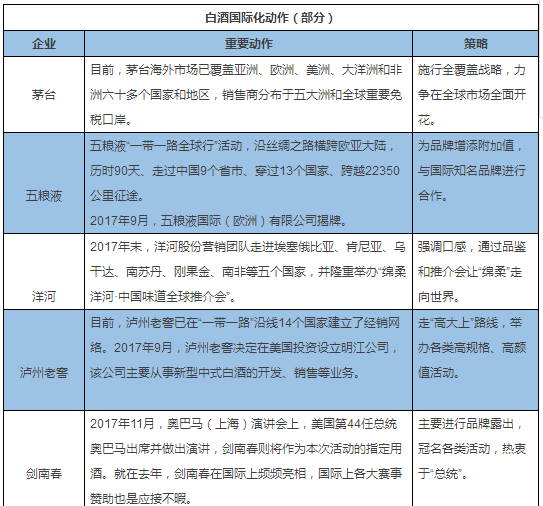 由此可見,白酒國際化的成果并不十分明顯,或者說還有這巨大的提升空間。就在近幾年,名酒企業(yè)紛紛走出去,特別是“一帶一路”戰(zhàn)略提出后,更多的白酒企業(yè)都向著國際化進(jìn)發(fā)。