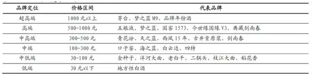對于市場上在售的白酒品牌,一般可依據品質和售價的不用劃分為高、中、低端三類,由于品類繁多,有時還可進一步細分為超高端、高端、中高端、中端、中低端和低端等,產品定位的界限比較明確。