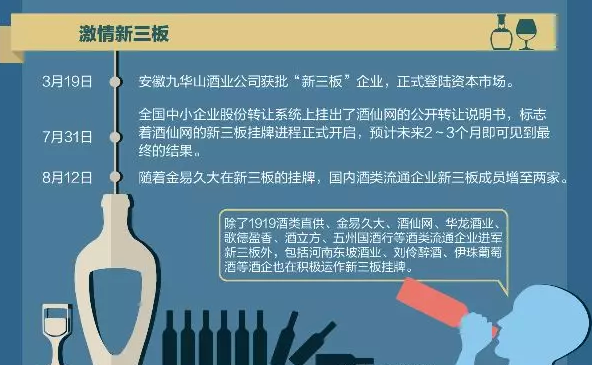 統計發現,除了1919酒類直供、金易久大、酒仙網、華龍酒業、歌德盈香、酒立方、五州國酒行等酒類流通企業進軍新三板外,包括河南東坡酒業、劉伶醉酒、伊珠葡萄酒等酒企也在積極運作新三板掛牌。