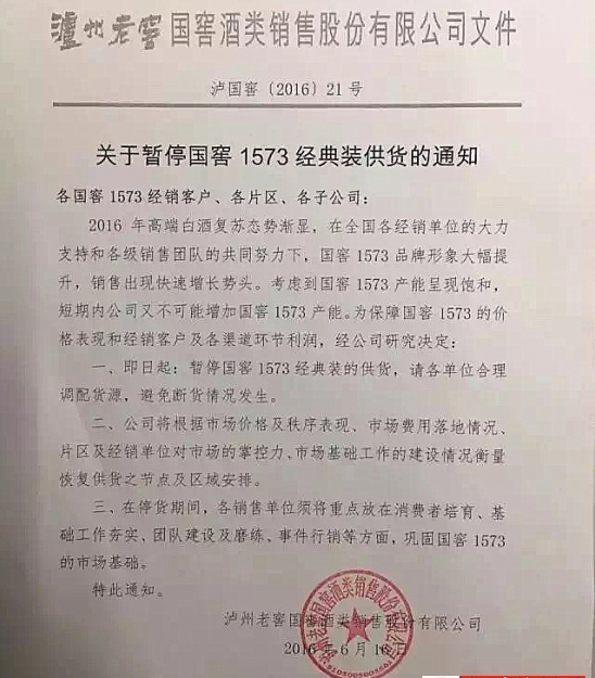 早在今年5月初,瀘州老窖國窖酒類銷售股份有限公司發布了一則《關于國窖1573(中國品味)價格體系的通知》,通知中要求經銷客戶、各片區、子公司從即日起,國窖1573(中國品味)開始全面提價。中國品味的調價被筆者在內的大多數業內人士解讀為為國窖1573漲價打前站,果不其然,僅僅一個半月時間猜測就得到了印證。