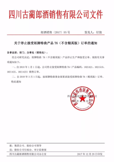 2018年1月2日,元旦節后第一天,微酒記者獲得來自郎酒銷售公司于2017年12月29日下發的《關于停止接受郎牌特曲產品T6(不含精英版)訂單》的通知。
