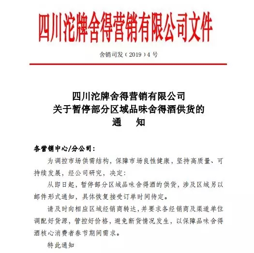 1月15日,酒業家記者從相關渠道獲悉,舍得酒業于昨日下發了《關于暫停部分區域品味舍得酒供貨的通知》。《通知》稱,從即日起,暫停部分區域品味舍得酒的供貨。有行業人士認為,旺季停貨,犧牲銷量的背后或為價格的提升。