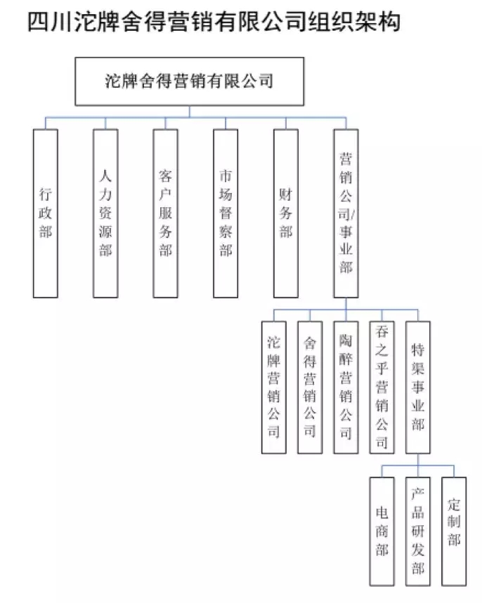 在其架構中,有沱牌營銷公司、舍得營銷公司、陶醉營銷公司、吞之乎營銷公司及特渠事業部。其中,特渠事業部將由電商部、產品研發部、定制部組成。