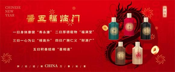 至于更加貼合節日氣氛的“五福臨門”系列,則是針對節日期間送禮的市場需求設計的。“五福臨門”這一名稱本身就承載了美好的寓意,五款醬酒分別是身體康健“壽永康”;厚德載物“福滿堂”;一心為公“祿高升”;廣施仁義“財源廣”;積善結緣“喜相逢”,蘊含著醬酒五味,人生五行,追求五福文化內涵,與春節迎福納祥的主題不謀而合。其瓶身設計傳統大方,既有醬酒的經典韻味,又不失現代審美,能夠作為禮物表達對親朋好友新年的祝福和心意。這種產品不僅用于私人贈送,也適合作為企業對外合作伙伴的禮品,傳遞著對未來合作的美好預期。