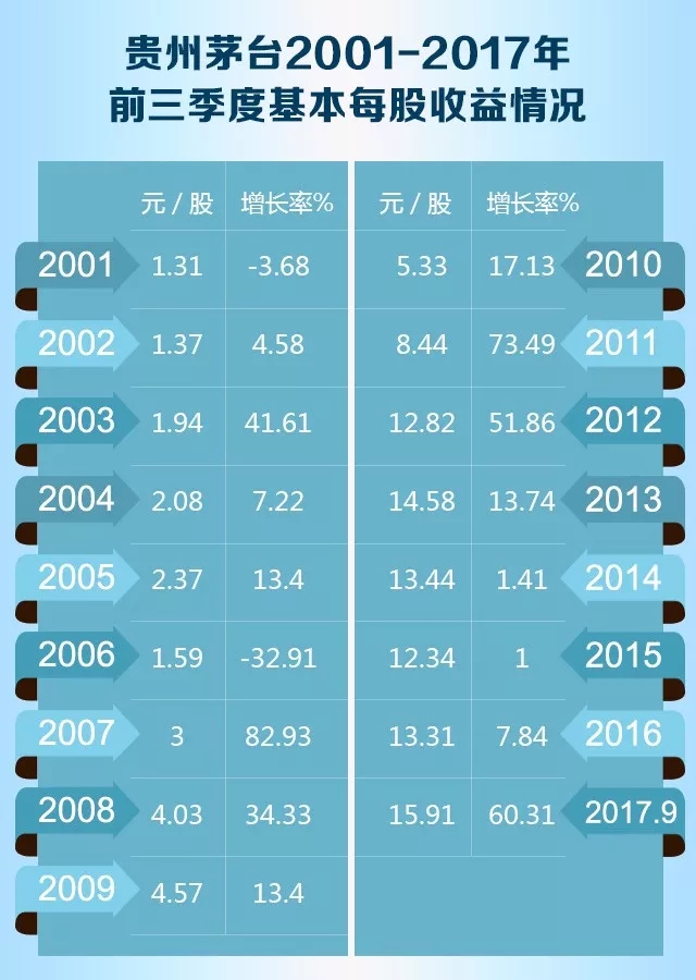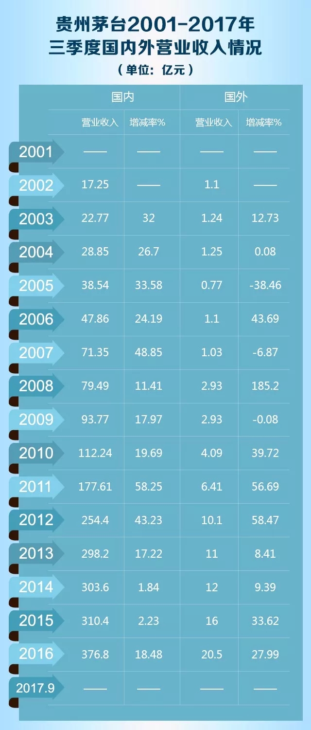 在中國白酒行業,茅臺從銷售、利潤到市值等維度均成為孤獨領跑者的酒業“獨角獸”。數據是最直觀的。就此,小編梳理了茅臺從2001年上市以來至2017年前三季度的關于生產量,營收、凈利潤,基本每股收益,以及國內外營業收入情況的關鍵數據。或許,這17年間的數據能夠讓你從中讀懂茅臺,領略茅臺的強大。