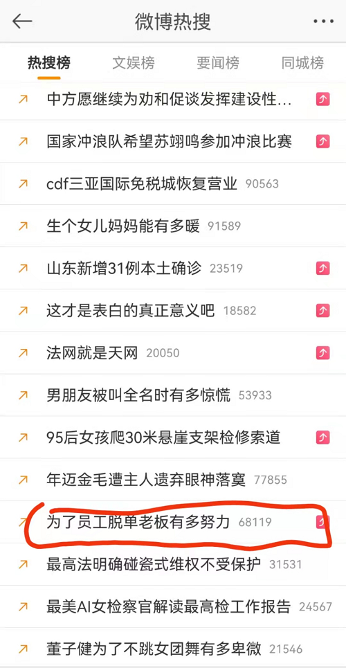 “為了員工脫單老板有多努力”、“現在脫單都這么卷的嗎”、“廣東老板才是催婚天花板”等話題更是一度進入全國熱搜榜單,上升實時熱點,同時達到同城熱榜第一,總計曝光量破億。