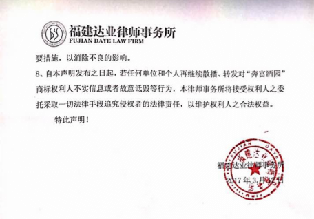 8、自本聲明發布之日起,若任何單位和個人再繼續散播、轉發對“奔富酒園”商標權利人不實信息或者故意詆毀等行為,本律師事務所將接受權利人之委托采取一切法律手段追究侵權者的法律責任,以維護權利人之合法權益。