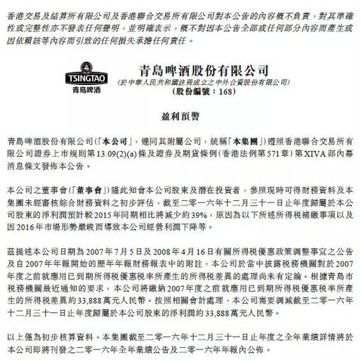 青島啤酒解釋稱,根據青島市稅務機關最近通知的要求,公司將繳納2007年度之前就應用已到期所得稅優惠稅率所產生的所得稅差異約33,888萬元人民幣。按照相關會計處理,公司需要調減至2016年12月31日止年度歸屬于本公司股東的凈利潤約33,888萬元人民幣。