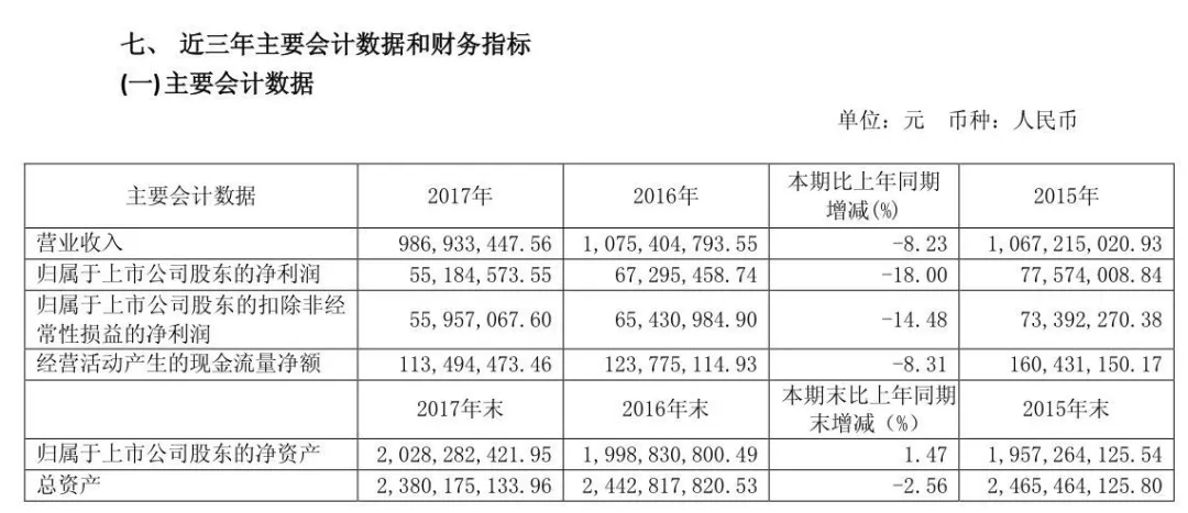 3月30日下午,金楓酒業發布2017年年報。其2017年營收為9.87億元,同比下滑8.23%,凈利潤為5518.46萬元,同比下滑18%。綜合金楓酒業2016年的數據(凈利潤為6729.55萬元,同比下滑13.25%),其凈利潤已連續兩年下滑。