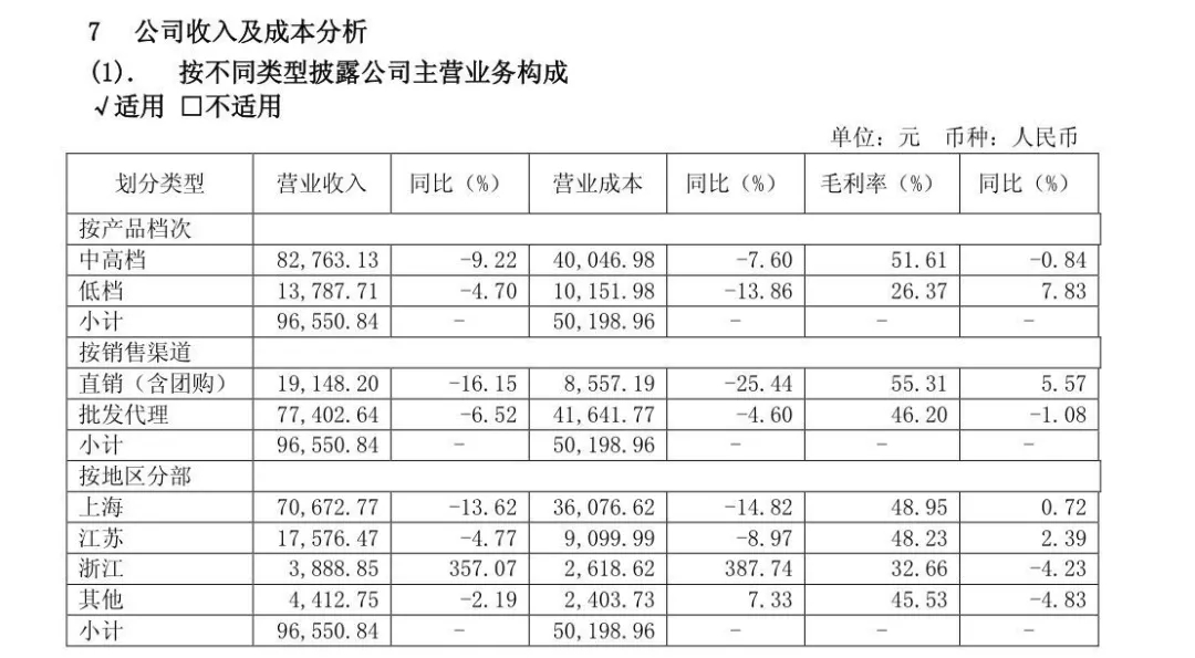 年報顯示,金楓酒業2017年中高檔產品營收為8.28億元,同比下滑9.22%;低檔產品營收為1.38億元,同比下滑4.7%;渠道上直銷(含團購)渠道2017年營收為1.91萬元,同比下滑16.15%;批發代理渠道2017營收為7.74億元,同比下滑6.52%;從區域市場來看,上海市場營收為7.07億元,同比下滑13.62%;江蘇市場營收為1.76億元,同比下滑4.77%;浙江市場營收為3888.85萬元,同比增長357.07%。