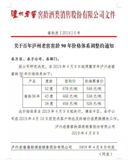 在8日的《關(guān)于百年瀘州老窖窖齡90年價格體系調(diào)整的通知》中顯示,自2019年4月9日起對于窖齡90年的團(tuán)購價與零售價進(jìn)行了調(diào)整,并要求4月16日前完成客戶傳達(dá)和終端價簽更換工作。而這是繼2018年11月8日整整五個月后的又一次針對窖齡90年的價格調(diào)整,且52度、43度、38度的團(tuán)購與零售分別上漲了50元,幅度不小。調(diào)整后: