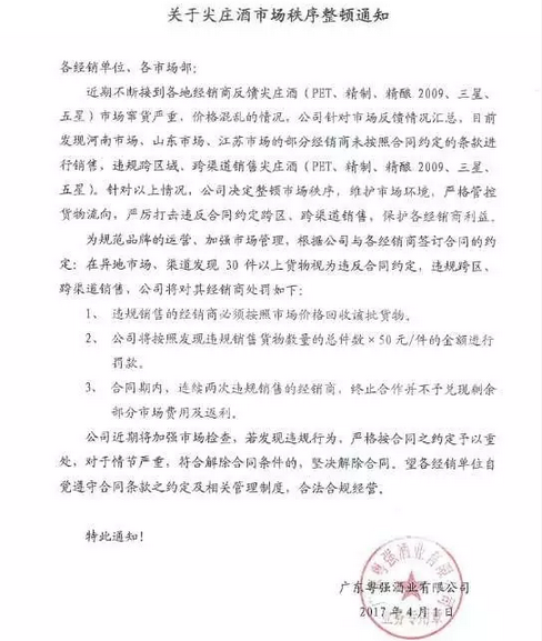 在本次的市場整頓中,粵強酒業表示,近期不斷接到各地經銷商反饋尖莊酒(PET、精制、精釀2009、三星、五星)市場竄貨嚴重,價格混亂的情況。通過實地調查、摸底,鎖定河南、山東、江蘇、河北市場部分經銷商,這些違規經銷商未按照合同約定的條款進行銷售。因此,粵強酒業為了規范品牌的運營,加強市場管理,根據公司與各經銷商簽訂的合同的約定:在異地市場,渠道發現30件以上的貨物視為違反合同約定,違規跨區,跨渠道銷售,公司將對其經銷商處罰如下: