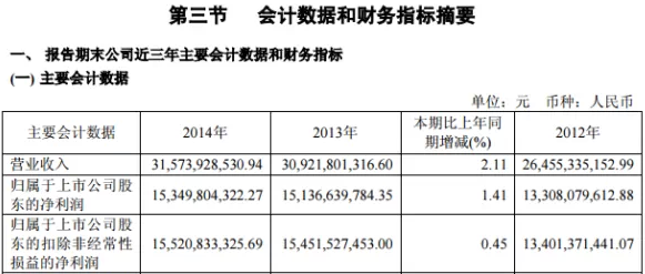 白酒巨頭貴州茅臺股份公司今日晚間公布2014年年報,2014年起實現銷售收入315.73億元,實現凈利潤153.49億元,分別同比2013年增長2.11%和1.41%,公司擬對公司全體股東每10股派送紅股1股、每10股派發現金紅利43.74元(含稅)。