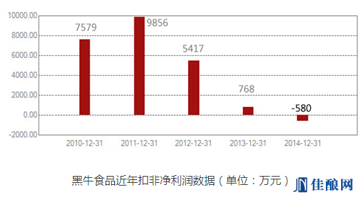 黑牛食品4月13日發布的2014年度報告顯示,2014年黑牛食品營業收入約5.83億,同比下降16.33%,扣非凈利潤約為-580萬,主營業務首次出現虧損。