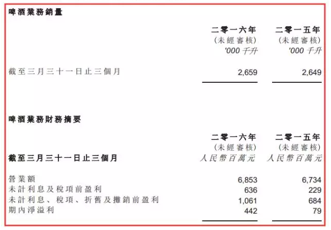 對于一季度業績表現,華潤啤酒表示較2015年同期有顯著改善,主要原因是淡季中檔及以上啤酒銷量增長帶來營業額上升,同時原材料成本降低。另外,銷售及分銷費用在期內也有所下降。