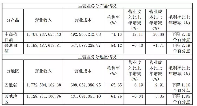 從區域上看,其安徽省內營收為17.72億,同比增長6.19%,安徽大本營市場繼續夯實,省外營收為11.29億,同比下降0.04%,基本與2017年持平。而根據其披露的一季報數據,其省內營收成績也相當亮眼,達到了7.43億元。