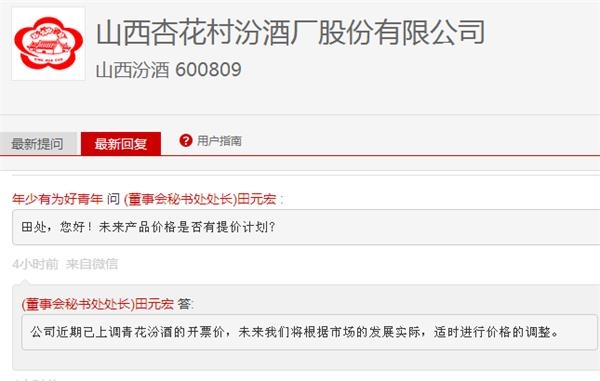 5月23日,山西汾酒董事會秘書處處長田元宏在網上答投資者問時確認,汾酒近期已上調青花汾酒的開票價,未來將根據市場的發展實際適時進行價格調整。