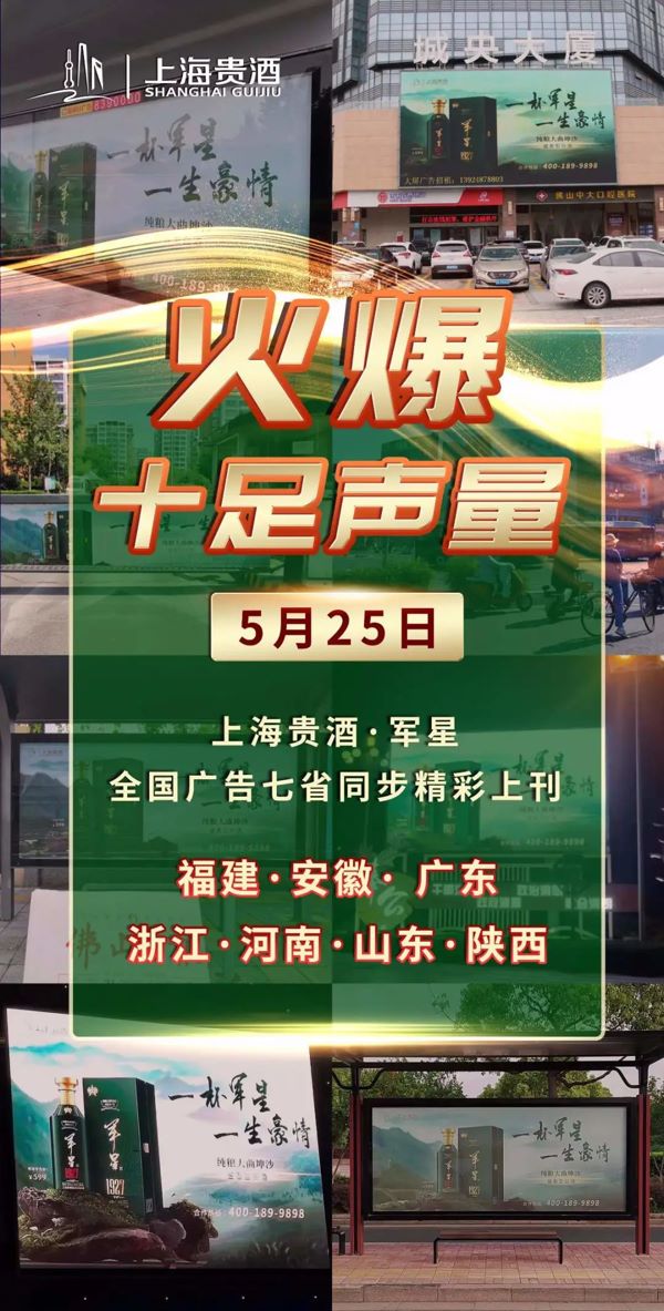 5月25日,上海貴酒·軍星的戶外廣告全國多地上刊,包括廣東、福建、浙江、安徽、河南、山東、陜西七省在內,廣告點位全國覆蓋,廣泛觸達,形式涵蓋公交站亭、公交車等出行場景及商圈、地標建筑等人流密集場所。這是一次全面、立體的品牌氛圍營造,面向全國消費者,全方位展現了上海貴酒·軍星卓越的品質與品牌影響力。