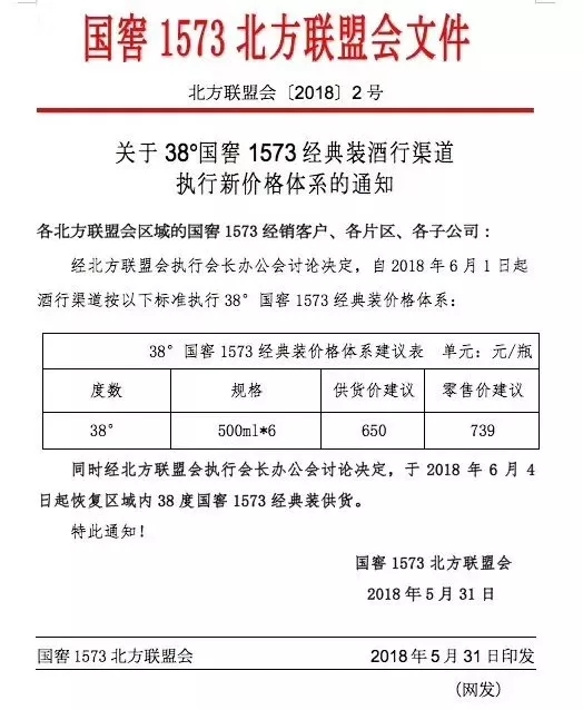 6月1日),微酒記者從市場獲悉:國窖1573北方聯盟下發了關于38度國窖1573經典裝酒行渠道執行新價格體系的通知。據通知稱:經北方聯盟會執行會長辦公會討論決定,自2018年6月1日起,酒行渠道38度國窖1573經典裝供貨建議價650元/瓶,零售價739元/瓶。