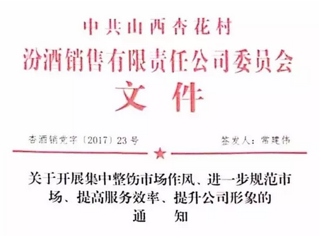 今天,汾酒銷售公司出臺了一份力度空前的文件,《關于開展集中整飭市場作風、進一步規范市場、提高服務效率、提升公司形象的通知》,該文件表示,從6月23日起至9月31日,汾酒將在全公司范圍內開展市場專項整治行動。將集中5個方面檢查問題。