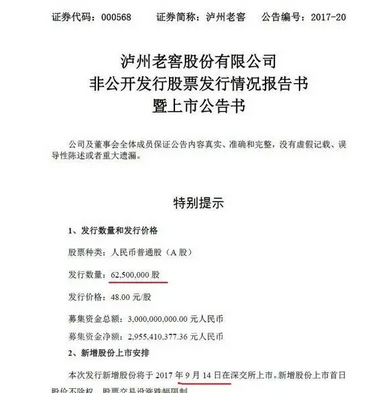 9月13日晚間,瀘州老窖(000568.SZ)在深交所發布公告稱,公司本次發行新增股份6250萬股,將于2017年9月14日在深交所上市。本次發行價格48.00 元/股,募集資金總額30億元人民幣。