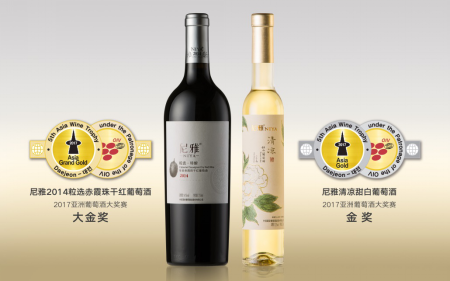 中信國安葡萄酒業作為中國新疆天山北麓生態產區的代表企業,旗下尼雅2014粒選赤霞珠干紅葡萄酒和尼雅清涼甜白葡萄酒不僅連獲兩枚金牌,尼雅2014粒選赤霞珠干紅葡萄酒更是摘得全球僅有27枚、中國僅有2枚的大金獎一枚。