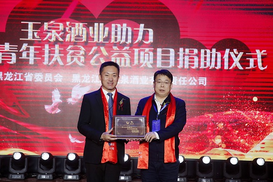 現(xiàn)場,玉泉酒業(yè)助力黑龍江省青少年扶貧公益項目也拉開了序幕。作為承載龍江人半個多世紀(jì)記憶的龍江白酒行業(yè)領(lǐng)軍企業(yè),玉泉酒業(yè)在堅守匠人精神釀造好酒的同時,也堅持用公益回饋社會的厚愛。現(xiàn)場為共青團黑龍江省委捐贈100萬元,通過團省委對“精準(zhǔn)扶貧”、“脫貧攻堅”,助力龍江全面振興貢獻自己的一份力量。共青團黑龍江省委也授予了玉泉公益企業(yè)牌匾,以此肯定和表彰玉泉酒業(yè)多年來對公益事業(yè)的關(guān)注和付出。