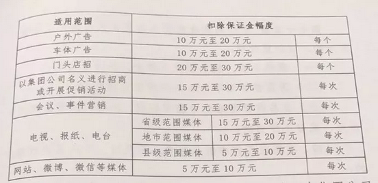 14、經(jīng)查實(shí)使用集團(tuán)公司品牌元素違規(guī)宣傳或未經(jīng)許可使用集團(tuán)公司品牌元素的,按以下標(biāo)準(zhǔn)扣除品牌保證金。