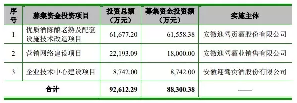 據(jù)了解,此前迎駕貢酒在上交所面向社會公眾發(fā)行普通股股票8000萬股,每股面值人民幣 1.00 元,發(fā)行價為每股人民幣 11.80 元,共計募集資金 9.44億元;扣除各項發(fā)行費用后實際募集資金凈額為 8.83億元。募集資金用于優(yōu)質(zhì)酒陳釀老熟及配套設(shè)施技術(shù)改造項目(約6.16億元,實施主體是迎駕貢酒股份有限公司)、營銷網(wǎng)絡(luò)建設(shè)項目(1.8億元,實施主體是迎駕酒業(yè)銷售有限公司)、企業(yè)技術(shù)中心建設(shè)項目(8742萬元,實施主體是迎駕貢酒股份有限公司)。