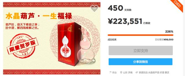 9月5日,首期眾籌籌得股東39人,資金335000元。9月6日,水晶葫蘆酒,一款市面上買不到的好酒在眾籌網進行了為期15天的產品眾籌。在眾籌期間,股東們對線上眾籌注入了源源不斷的有效流量,截止到9月21日,水晶葫蘆酒線上眾籌金額為216418元,目標金額達成為219%。截止到10月20日,水晶葫蘆酒雙線眾籌結束,共銷售水晶葫蘆酒40余萬,股東投資回報為7%。