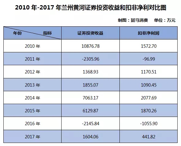 此前,蘭州黃河證券投資收益頗豐。斑馬消費梳理發現,2010年-2017年,蘭州黃河證券投資總收益2.44億元,為公司扣非凈利潤總和7070.54萬元的3.5倍。