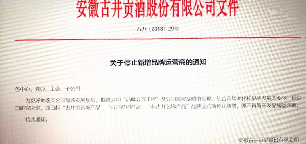7月20日,酒食匯記者獨家獲悉,安徽古井貢酒股份有限公司發布《關于停止新增品牌運營商的通知》。