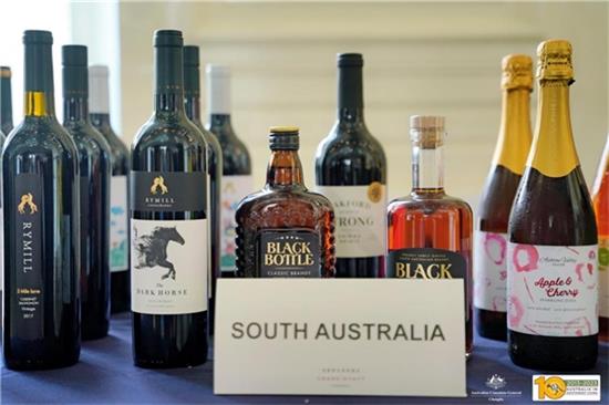 南澳州產品展示區GNT 展品:(左起)黑晶白蘭地,澳克福德葡萄烈酒,黑晶VSAP
