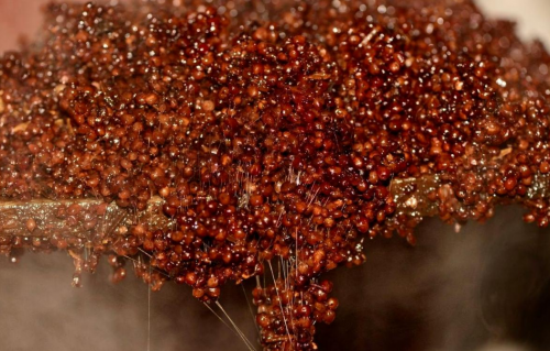 作為純糧釀造的白酒,禧大福酒甄選茅臺鎮獨有的紅纓子糯高粱為主要原料,這種原料在白酒業內被稱為“沙”。禧大福酒釀造過程共有兩次投料,分為“下沙”和“糙沙”。其中“下沙”指的是第一次投料生產的過程,在重陽時節開始,經歷潤糧、蒸煮、攤涼、加曲、堆積、入窖發酵,六道工序,步步匠心。“糙沙”即潤糧后,將高粱加入下沙的酒醅中,再加入大曲粉和下沙蒸餾得的生沙酒攪拌均勻以后收攏堆積發酵,進入窖池發酵。