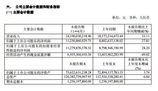 今日晚間,貴州茅臺(tái)披露半年業(yè)績(jī)報(bào),2017年上半年實(shí)現(xiàn)營(yíng)業(yè)收入241.90億元,同比增長(zhǎng)33.11%;實(shí)現(xiàn)營(yíng)業(yè)利潤(rùn) 161.24 億元,同比增長(zhǎng) 26.36%;實(shí)現(xiàn)凈利潤(rùn)112.51 億元,同比增長(zhǎng) 27.81%。