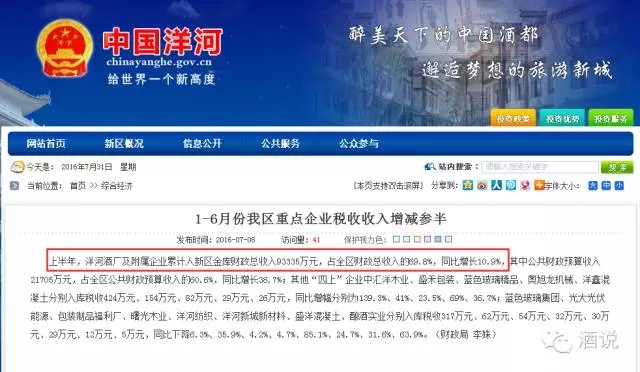 7月31日,小編在宿遷市洋河管委會官網的公開信息中看到這樣一條消息:2016年上半年,洋河酒廠及附屬企業累計入宿遷市洋河新區金庫財政總收入93335萬元,同比增長10.9%。