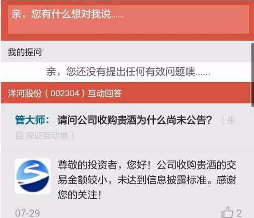 在分析洋河收購貴酒時,小編意外地在洋河股份投資者動態內容里發現了這樣的一個回答: