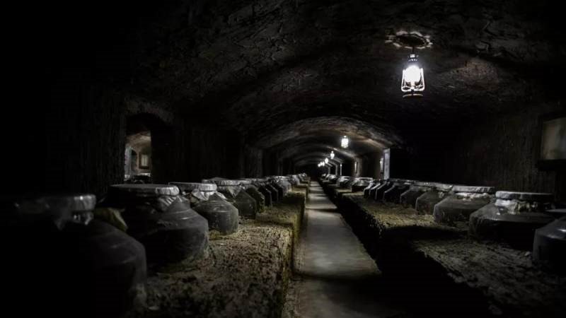 新春伊始,出甑新酒,吸取天之陽氣,謂之“天藏”;次年夏,置于樹蔭下晝享和風夜承雨露,吸取靈氣,謂之“地藏”;三年秋,深埋地下,下接地氣以吸收茅臺特有朱砂土質有益分子,謂之“窖藏”;入冬,大罐放入水塘一年,以去酒中多余之燥氣、土性。酒質老熟,由酒師施以妙手絕技勾兌封壇,謂之“水藏”;封壇之酒藏于山洞之中。壁間偶有靈泉滲出,儲酒處有清冽之氣而無寒意。只只酒壇宛如處子,靜而待發,謂之“洞藏”。