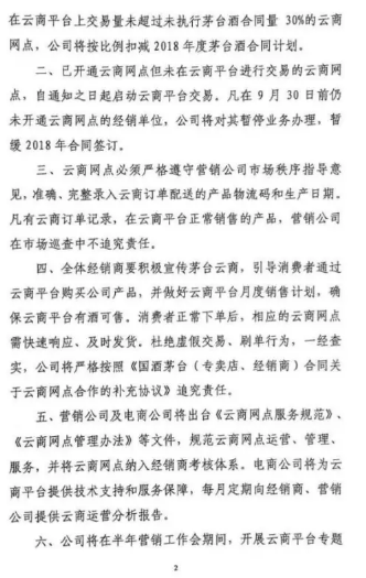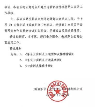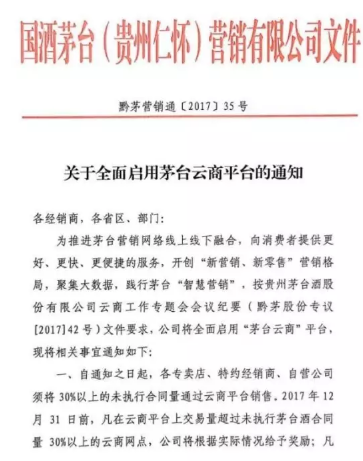 日前,酒業(yè)家記者從相關(guān)渠道獲悉,茅臺方面為推進茅臺銷售網(wǎng)絡(luò)線上線下融合,向消費者提供更好更快、更便捷的服務(wù),開創(chuàng)“新營銷、新零售”營銷格局,聚焦大數(shù)據(jù),踐行茅臺“智慧營銷”,已于8月14日下發(fā)了《關(guān)于全面啟用茅臺云商平臺的通知》。至此,茅臺云商正式得以落實。