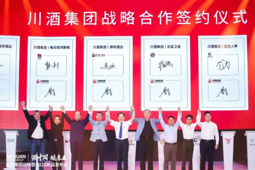 發布會最后,川酒集團還和上海保利酒業有限公司、壹玖壹玖酒類平臺科技股份有限公司、四川華龍祥酒業有限公司、每日經濟新聞智庫、鳳凰衛視有限公司、國寶人壽保險股份有限公司、四川全興酒業有限公司、環球佳釀酒業有限公司簽署了戰略合作協議。