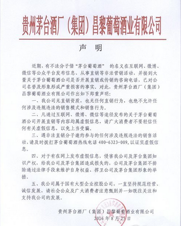 近日,茅臺葡萄酒公司發布辟謠公告聲稱,公司無直銷資質,也無任何直銷行為。全文如下: