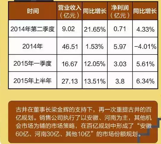 接下來,古井貢酒在2014年實現營業收入46.51億,凈利潤達到5.97億,其中營收同比增長1.53%。