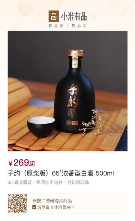 9月8日,網(wǎng)紅白酒子約新品星空版子約Ⅳ上線小米有品,酒體為65°真實(shí)原漿(貯存五年),由非物質(zhì)文化傳承人全程把控釀造,國家級品酒師對酒體優(yōu)中選優(yōu),是零添加不勾調(diào)的原生態(tài)封壇級珍品,僅售269元/瓶,上線當(dāng)日便獲得眾多消費(fèi)者購買嘗鮮。