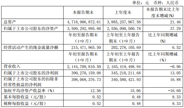 2015 年1-9月,安徽迎駕貢酒股份有限公司實現營業收入21.45億元,同比降低0.96%;實現歸屬于上市公司股東的凈利潤3.9億元,同比增長13.05%;基本每股收益 0.52元,同比增長8.33%。