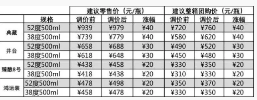 我司即日起調(diào)整旗下部分產(chǎn)品的建議零售價(jià)和建議整箱團(tuán)購(gòu)價(jià),典藏系列上調(diào)40元,井臺(tái)系列上調(diào)30元,臻釀8號(hào)及鴻運(yùn)裝上調(diào)20元。